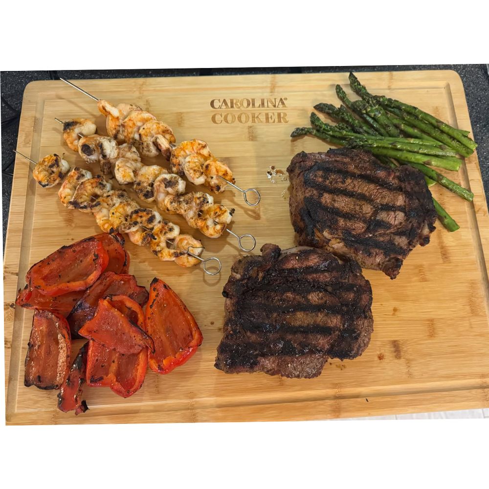 Mabe for Carolina Cooker®, this natural bamboo cutting board features an extra-large cutting surface 12 inches x 17 inches and is reversible with a dip groove on one side to catch juices.