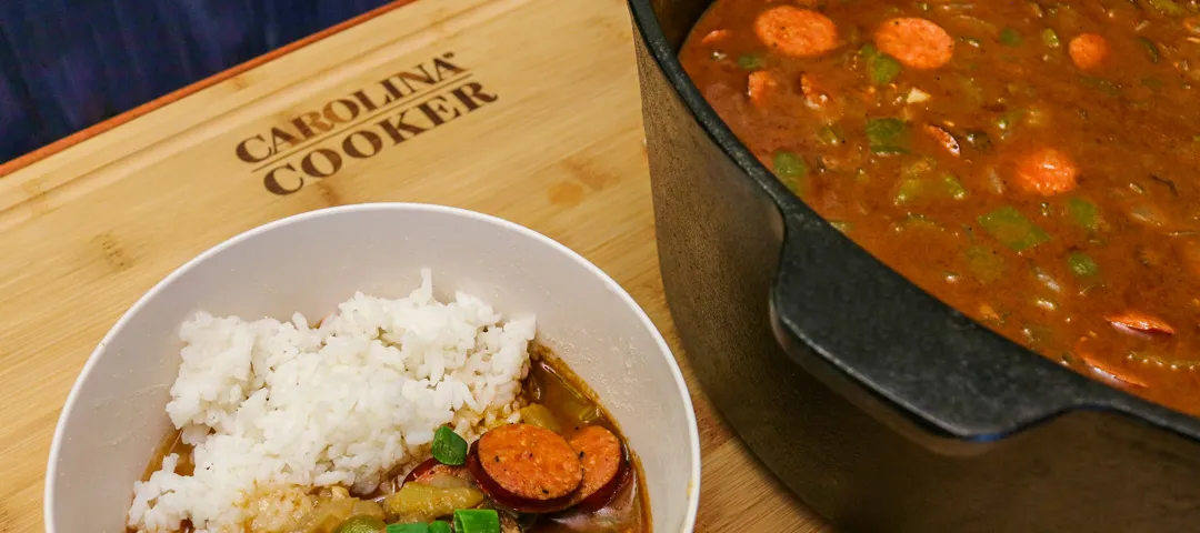 What's the key to great gumbo? Find out with this Louisiana inspired recipe! Create a rich roux sauce combined with roasted chicken, andouille sausage, fresh vegetables & creole spices. Much like the cultures you would find in New Orleans, this Carolina Cooker gumbo offers a robust and diverse blend to make it equally hard to forget!
