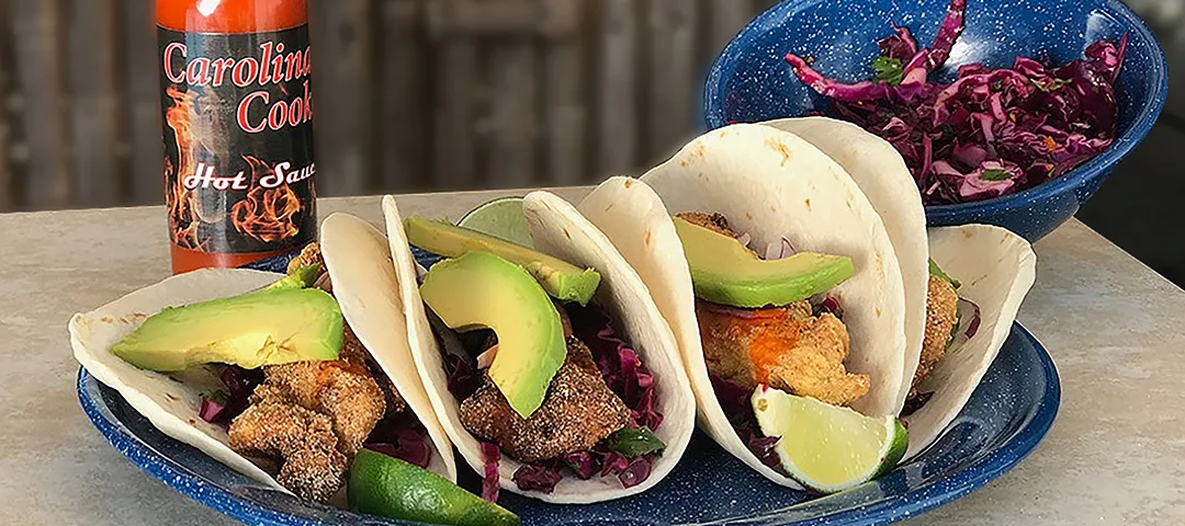 Vibrant, crunchy and terrifically tangy - We can't get enough of fish tacos! Flounder is our go-to-fish for this recipe because of the freshness & textures of the fillet; But you can try it out with tilapia or sea bass too! Topped with red cabbage and a generous drizzle of sour cream & guacamole, this is one heck of a catch! A quick pan-sear in your cast iron skillet, and a handful of fresh ingredients is all you need to bring out the best in your seafood.