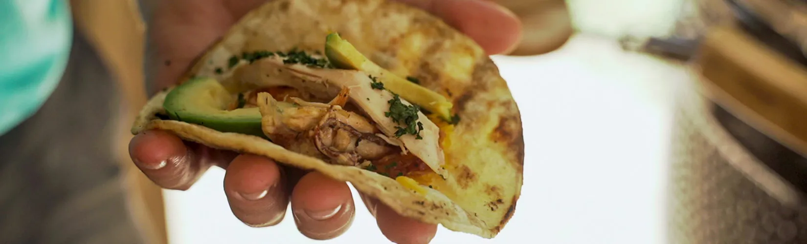- Once tortillas and chicken are warm, add chicken, cheese, cilantro, avocado, and a squirt of lime.