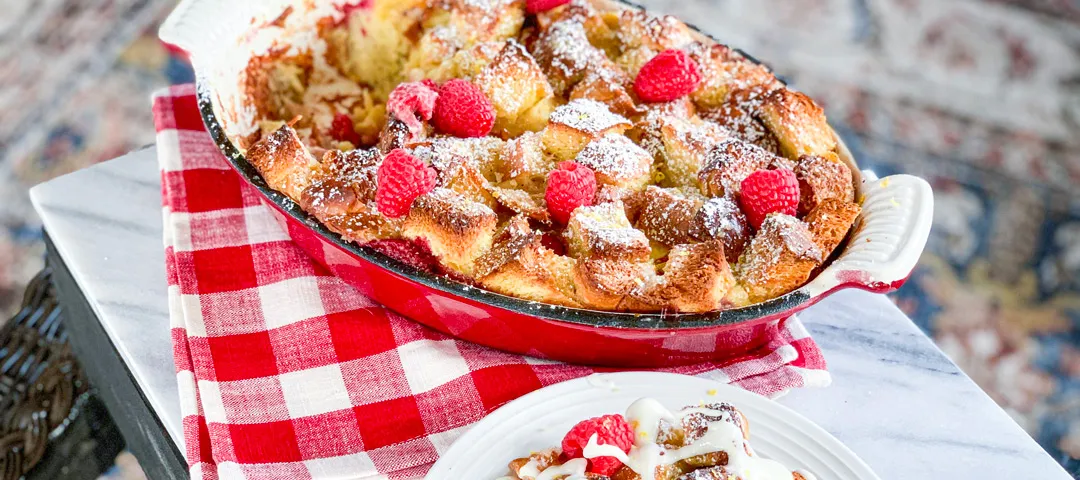 This french toast is heavenly! There's no other way to describe it. Baked to perfection in the Carolina Cooker® red enamel cast iron dish, the top is crunchy and the inside is gooey & delicious. The best part is, there's minimal work involved and you can make it the night before! Or if you love breakfast for dinner, it's the perfect pair with bacon and eggs. Baking french toast with cast iron is much easier than standing in front of a griddle dipping and frying. The addition of lemon and raspberry also work well together in this recipe to create a fruity fresh, tart flavored dish.
