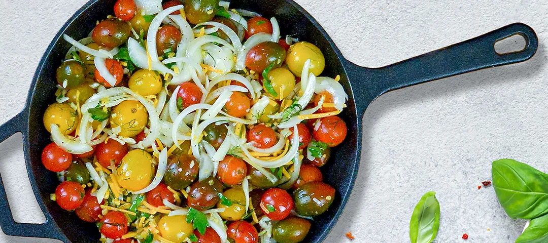 Get a new start with this tomato tart! Baked in no time at all, this is a savory-style of tart with onions, fresh cherry tomatoes and best of all cheese to bring it all together. Nicknamed "tomato pie" this recipe is a new way to get the goodness of your seasonal produce in one meal. Experiment with your own extra toppings like different cheeses or even balsamic glaze drizzled over top for a fantastic appetizer idea.